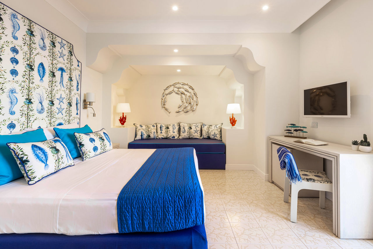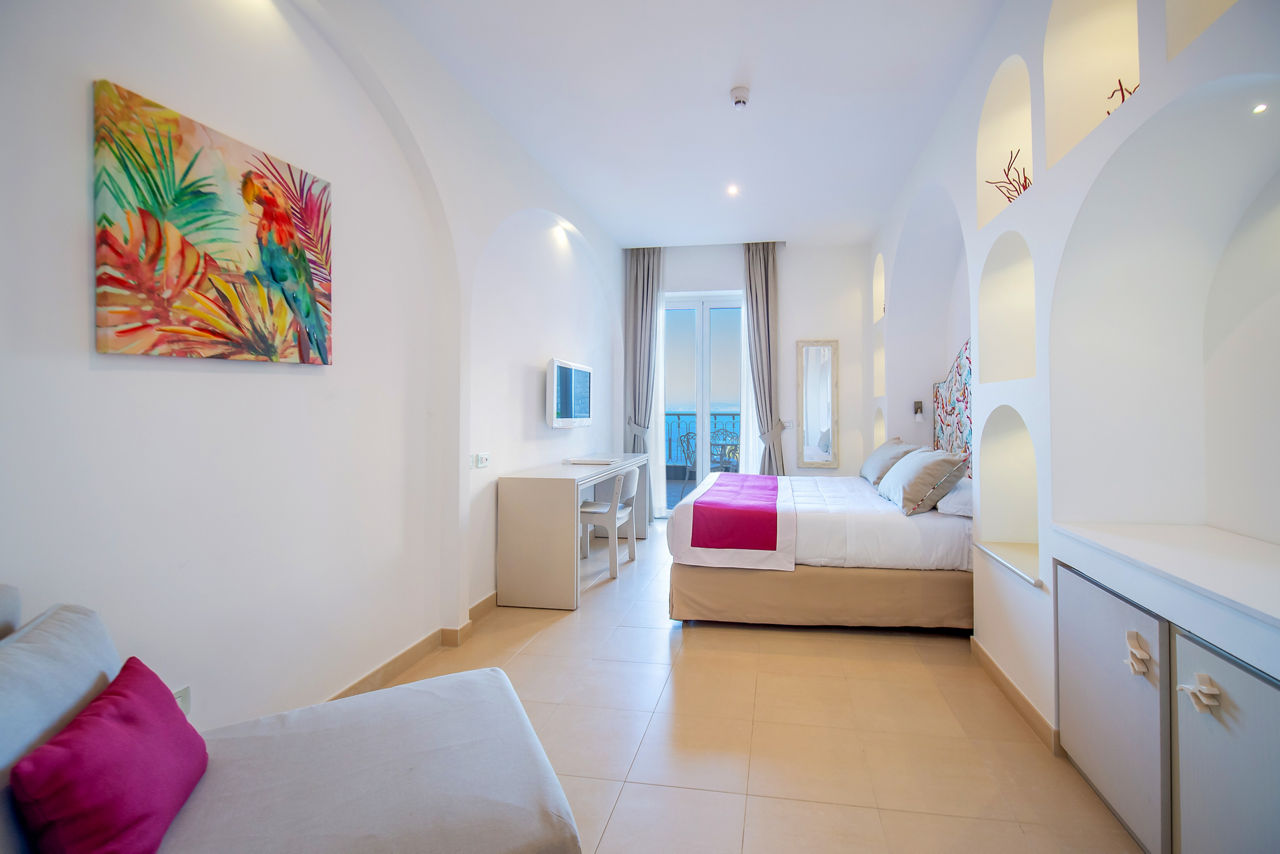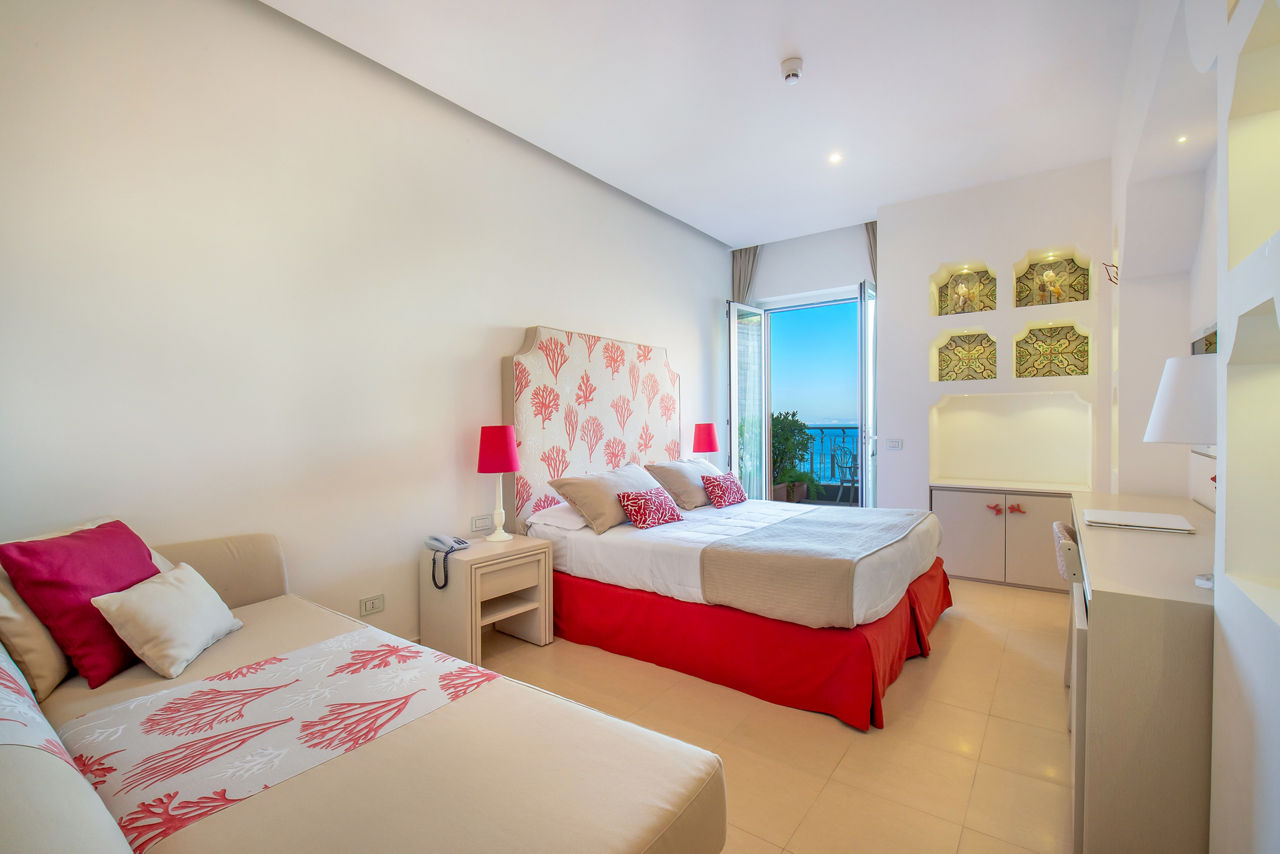 With a stunning clifftop position, this historic hotel has elegantly blended past and present d?cor throughout to create the perfect setting for your Sorrento holiday. Once known as the ?Albergo Cappuccini? meeting point for intellectuals and artists, the property has accommodated many famous historic artists including Luigi Pirandello. The hotel?s pool sits peacefully on a sun-kissed solarium along with breathtaking Gulf of Naples views and an ? la carte restaurant. When you want to explore the local area, hop on the hotel?s complimentary shuttle service to Sorrento resort centre.Standard rooms sleep 2 adults and have bathroom containing a shower, air conditioning, hairdryer, flat screen television, mini-bar, safety deposit box and view of the interior. Classic Double or Twin rooms with partial sea views and Superior Double or Twin rooms with Balcony have two chairs, a small table and sea views are also available.