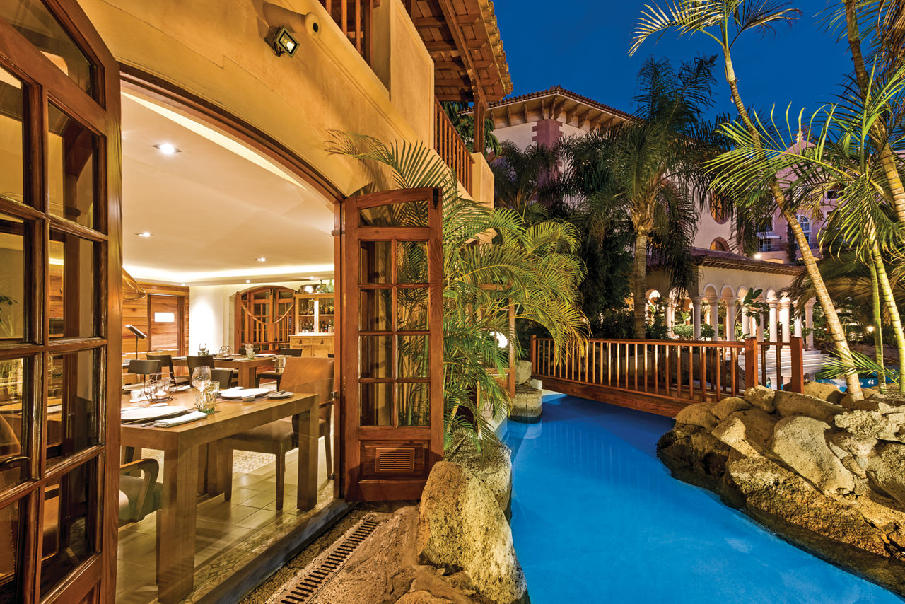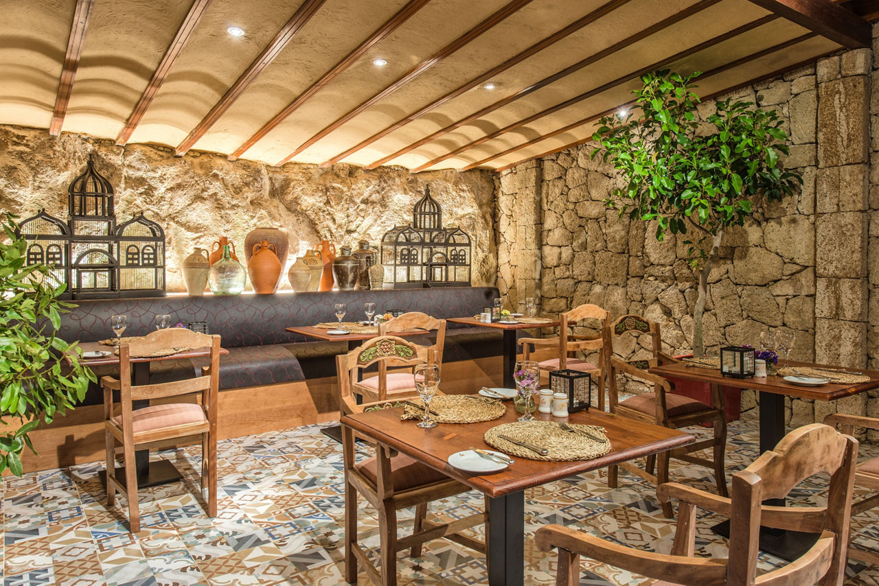 8 restaurants; El Bernegal buffet style, La Brasserie serving French cuisine, La Trattoria Italian restaurant, Asia-Kan seriving Oriental cuisine, Beach club, La Tasca Spanish restaurant, Las Aguas (adult only) serving Canarian cuisine and the Garden Café offering a healthy Spa menu. 2 snack bars; Burger bar Azul and Brasserie snack bar. 7 bars; Bar Brasserie, Lobby bar, Piano bar, La Zumeria, Beach club, Sports bar and Wine bar.Entertainment