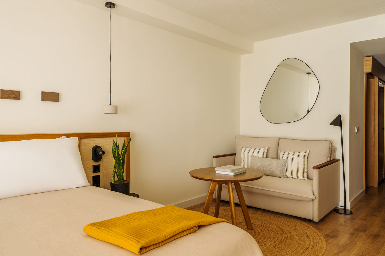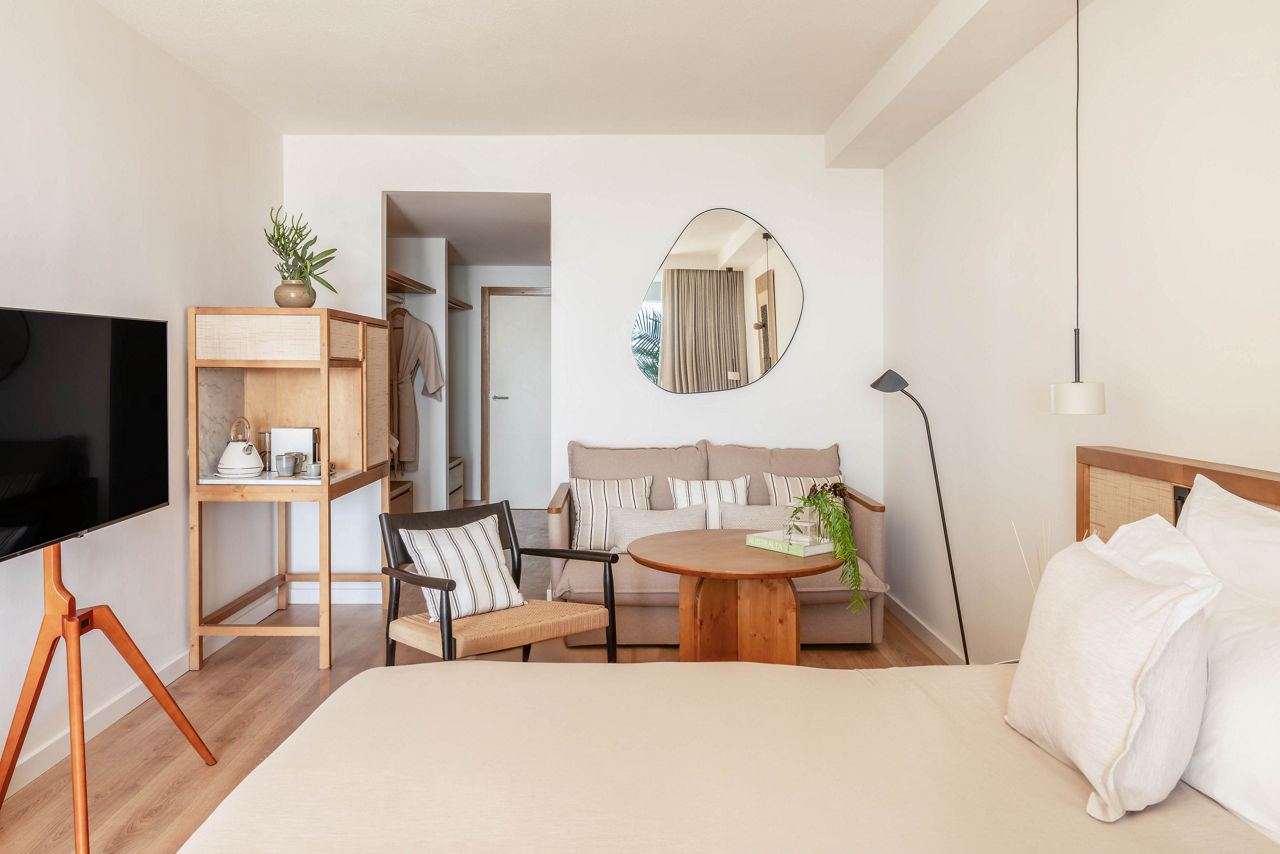 Double rooms sleep up to 3 adults or 2 adults and 2 children and have terrace with garden view, bathroom with hairdryer, air-conditioning, small fridge and Satellite TV. Double rooms with sea view also available. Double Casas del mar rooms are in 4 buildings separate from the hotel and have the same facilities as double with sofa bed and two coffee tables, and bar/cabinet with microwave oven, fridge, sink and glass rack. Double ?level? rooms are also available and have sea views, pillow menu, Bathrobe and slippers, access to private breakfast room for ?level? guests only, access to the outdoor sun terrace with two hydromassage tubs from 10 am to 5 pm, access to The Level Lounge from 10 am to 5 pm with cakes, coffee, tea, soft drinks and fresh fruit (subject to changes with no advance warning), free Internet using the 2 computers in The Level Lounge, daily newspapers on request and subject to availability on the island and a one hour visit to the sauna, hydromassage and Turkish bath in the hotel SPA for every week of your stay.