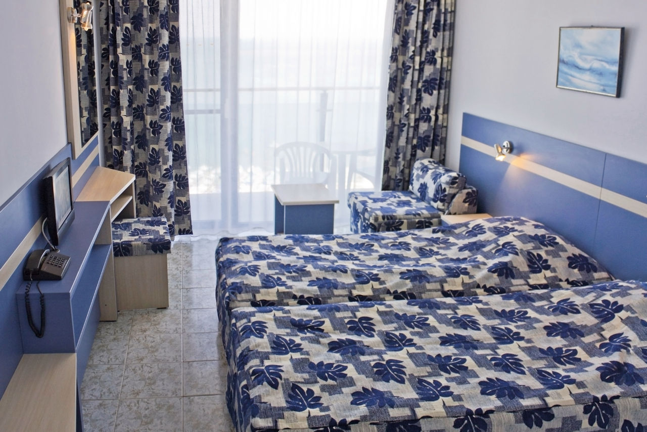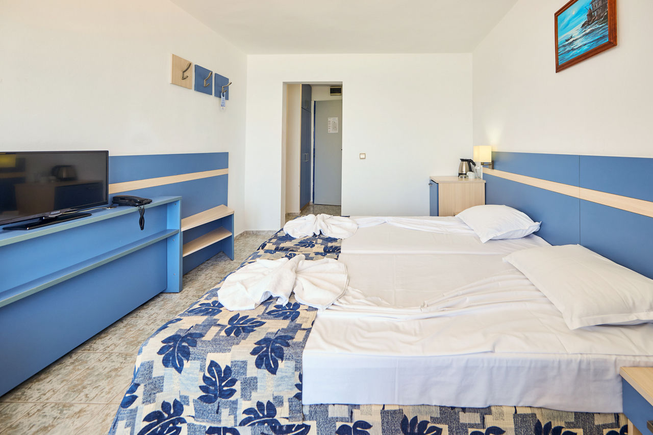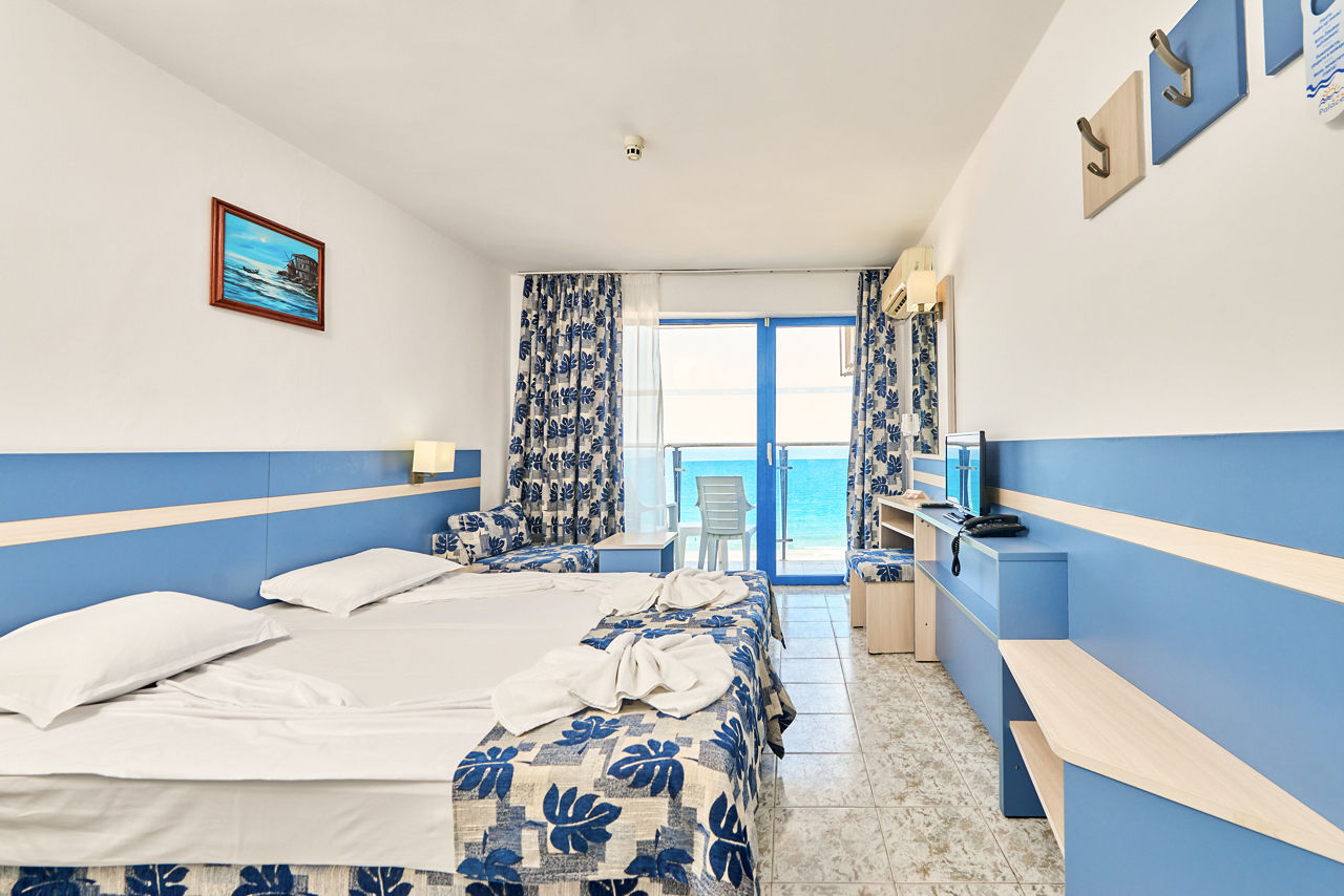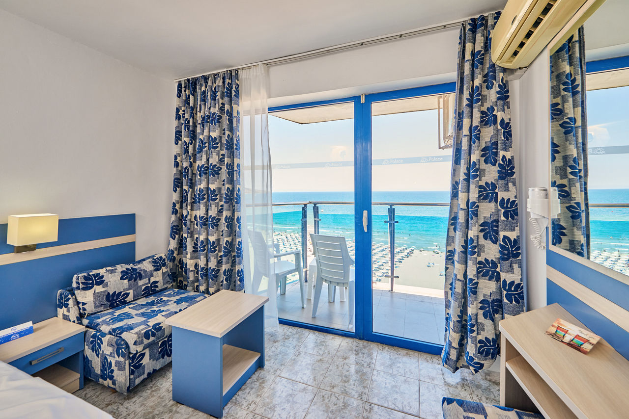 Hotel Palace Sunny Beach is perfectly situated right next to the Black Sea, offering stunning views and easy access to shops, bars, and restaurants. This prime location sets the stage for a fun-filled holiday in Bulgaria. The bright and comfortable rooms provide the perfect retreat after a day of adventure, ensuring you can unwind and recharge. Or maybe you'd fancy an evening at the hotel Karaoke bar? Your ideal chilled-out getaway awaits.Double or Twin rooms sleep up to 3 adults and have bathroom containing a shower, air conditioning, hairdryer, television, fridge and balcony. Sole Use rooms and Apartments are also available.