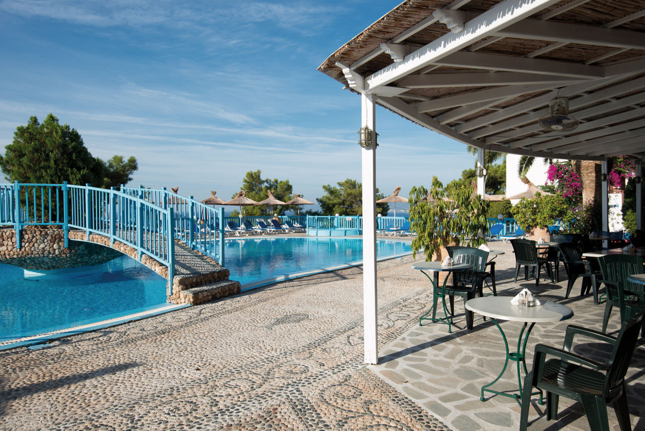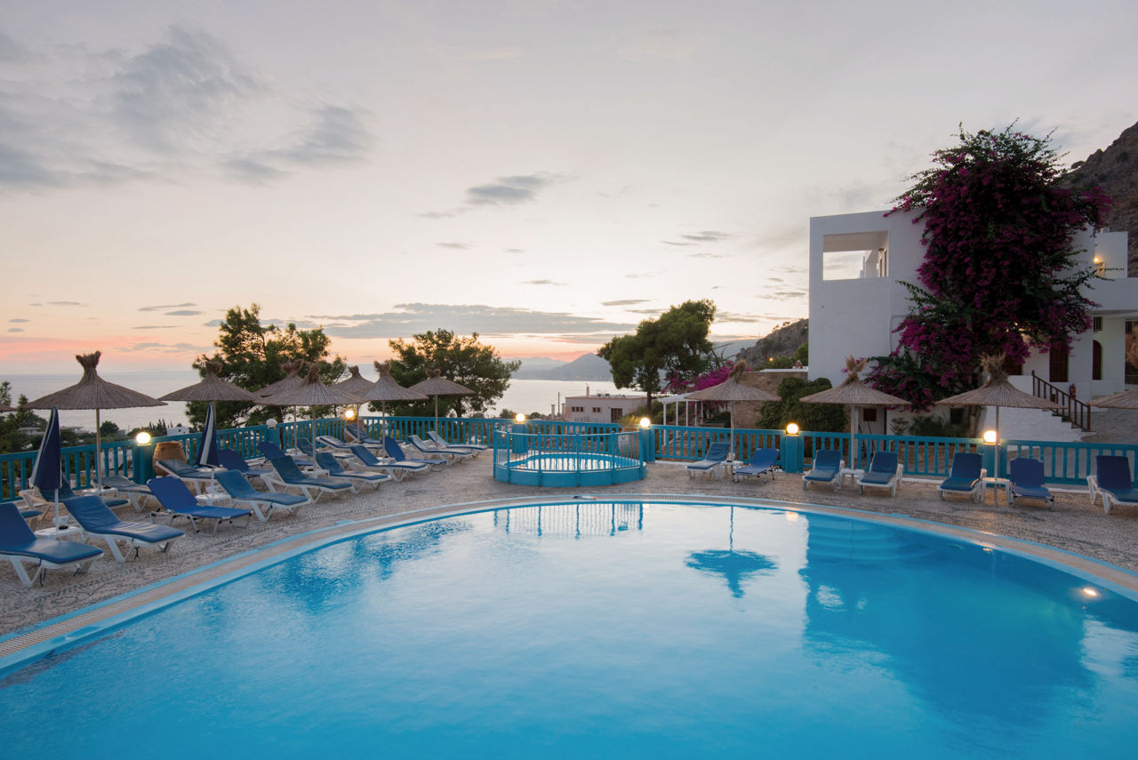 Outdoor swimming pool surrounded by sun loungers and umbrellas.Karpathios Studios