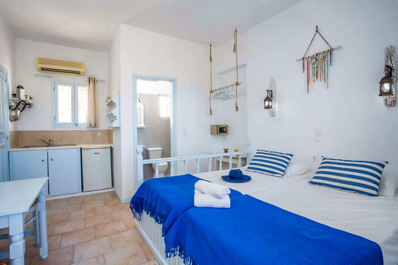 Studios sleep up to 3 people and have bathroom with shower, air-conditioning*, kitchenette with fridge and cooking rings, and a balcony or terrace (some shared).