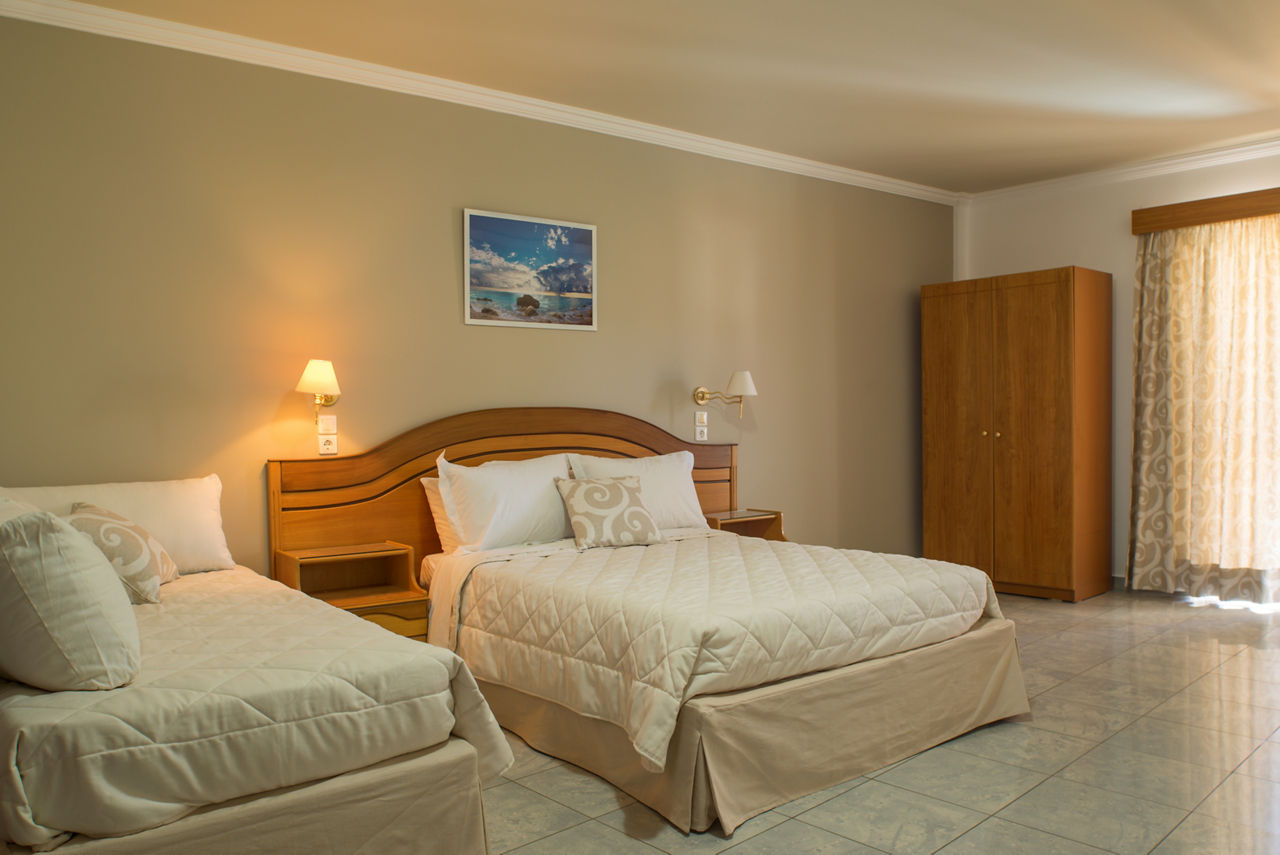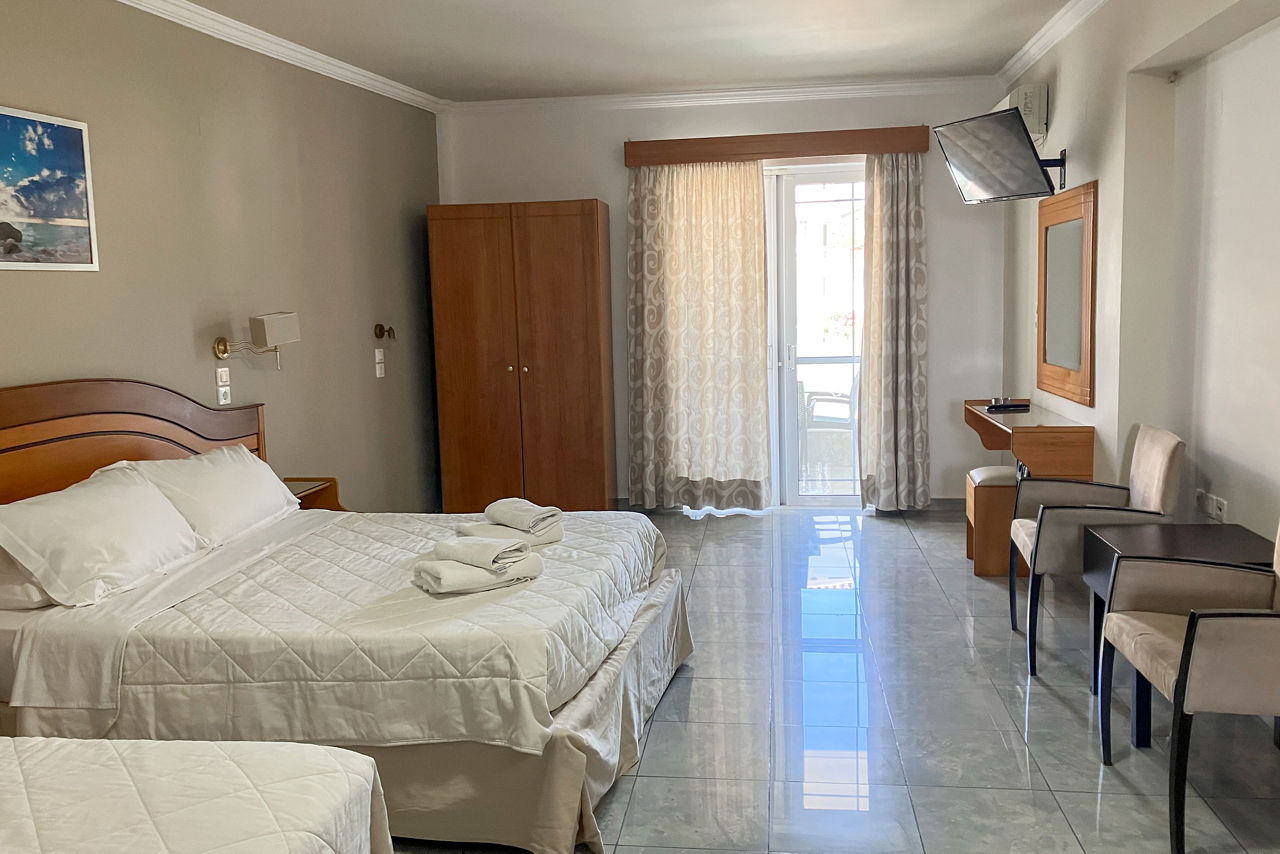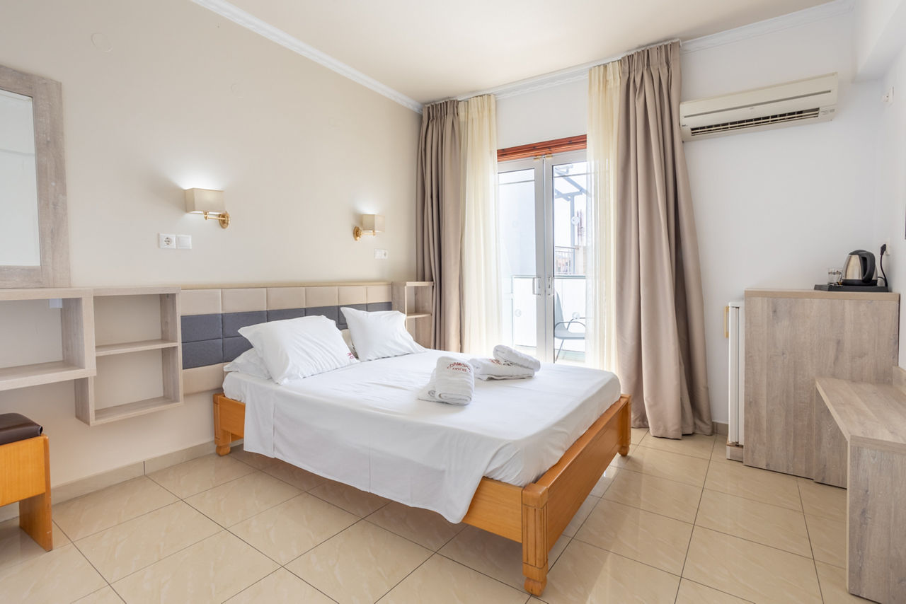 Like to be in the heart of the action? We?ve got just the spot for you! Cosmopol Hotel boasts a central postcode, with easy access to local attractions, restaurants and a yacht-lined harbour. The simple, well-sized rooms all feature either a balcony or terrace. Your first meal of the day is covered on Bed & Breakfast, then why not sample some of the local tavernas? Ready for a refreshing dip? Head down to the lovely pool area and make a splash. The beach is within walking distance too.Double room sleep up to 3 adults and have bathroom containing a bath or shower, air conditioning, flat screen television, fridge, kettle and a balcony.