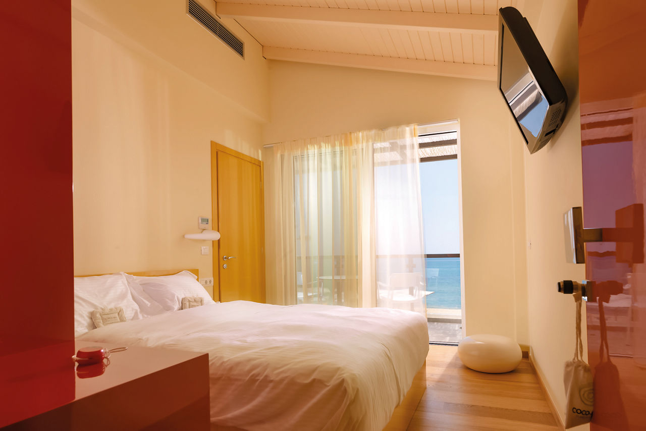 Deluxe Double with Sea View rooms sleep up to 2 adults and have a bathroom containing a shower, air conditioning, hairdryer, flat screen television, safety deposit box and balcony or terrace.