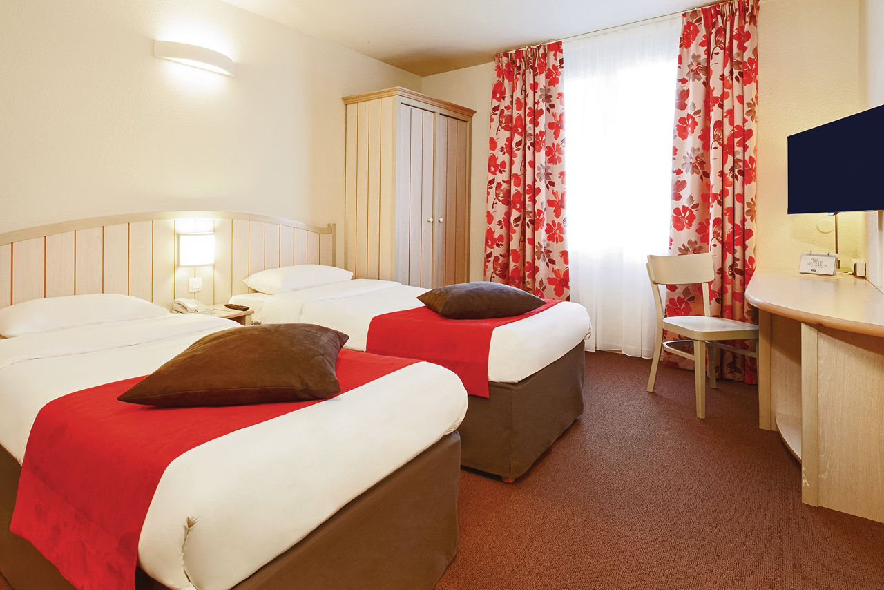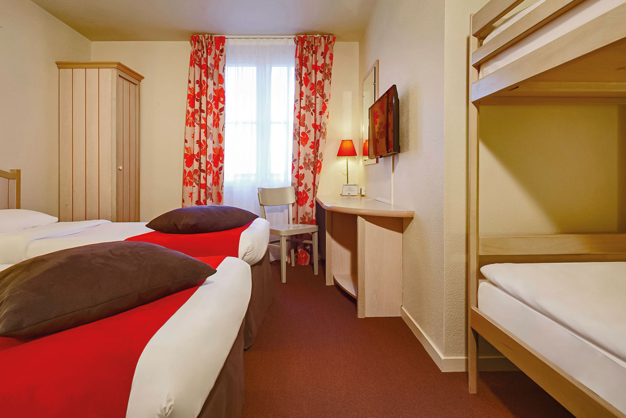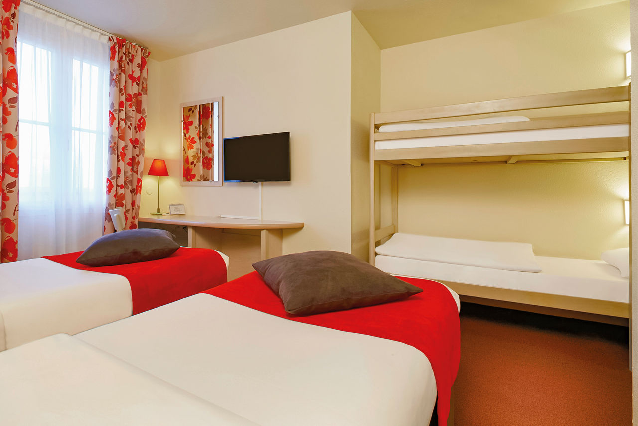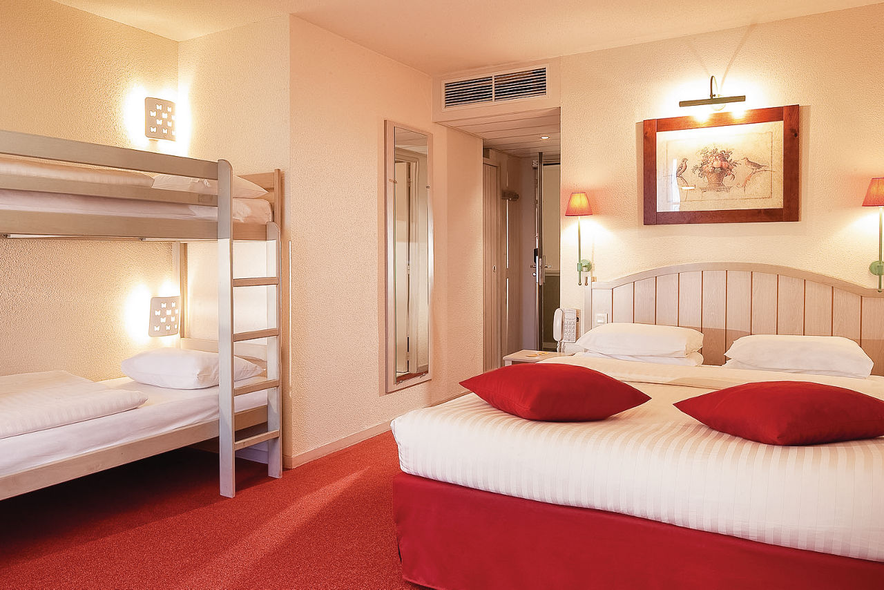 This hotel in the style of a French farmhouse offers a welcoming and relaxing atmosphere where you will re discover the charms of a traditional family home and is a great choice for families. A buffet breakfast will set you up for your day exploring and a buffet dinner will await you on your return, a perfect choice for the little ones plus a hotel bar where you can relax. The main attraction of the hotel is the Eco Farm where the little ones will adore the alpacas, ponies, sheep, goats, guinea pigs, rabbits and even a donkey! Disneyland? Paris is easily accessible by the complimentary shuttle service and for those looking to explore further, Val'D'Europe shopping centre is within easy reach plus the centre of Paris is less than an hour away by train. For a great value break with traditional hospitality, the Campanile Val de France is a perfect choice.Double or Twin rooms sleep 2 adults and have bathroom containing a bath with shower attachment, air conditioning, hairdryer and safety deposit box. Room upgrade options and Family rooms with bunk beds are also available.